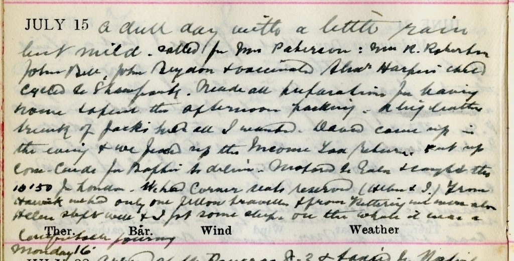 A dull day with a little rain but mild. Called for Mrs Paterson1 : Mrs R Robertson,2 John Bell,3 John Brydon4 + vaccinated Alexr Harper’s child.5 Cycled to Shawpark.6 Made all preparations for leaving home + spent the afternoon packing. A big leather trunk of Jack’s7 held all I wanted. David8 came up in the evening + we fixed up the Income Tax return. Put up Communion Cards for Baptie9 to deliver. Motored to Gala + caught the 10:50 for London. We had corner seats reserved (Helen + I) . From Hawick we had only one fellow traveller + from Kettering we were alone. Helen slept well + I got some sleep. On the whole it was a comfortable journey.