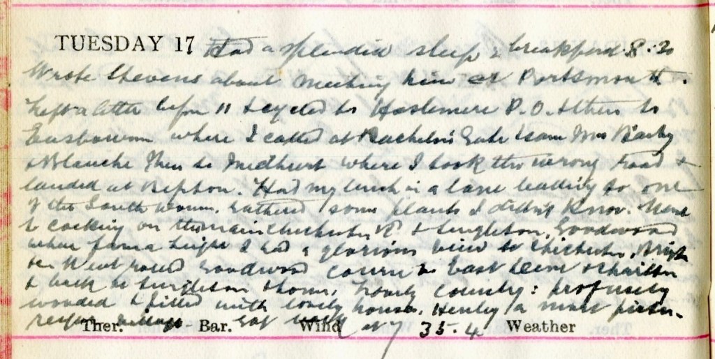 Had a splendid sleep + breakfasted 8:30. Wrote Stevens1 about meeting him at Portsmouth.2 Left a letter before 11 + cycled to Haslemere P.O.+ then to Easebourne where I called at Bachelor’s Gate3 + saw Mrs D’Arcy4 + Blanche.5 Then to Midhurst where I took the wrong road + landed at Bepton.6 Had my lunch in a lane leading to one of the South Downs.7 Gathered some plants I didn’t know. Went to Cocking on the main Chichester road + Singleton, Goodwood8, where from a height I had a glorious view9 to Chichester, Brighton +c. Went round Goodwood course to East Dean and Charlton10 + back to Singleton + home. Lovely country : profusely wooded + filled with lovely houses, Henley11 a most picturesque village. Got back at 7 [after] 35.4 miles.