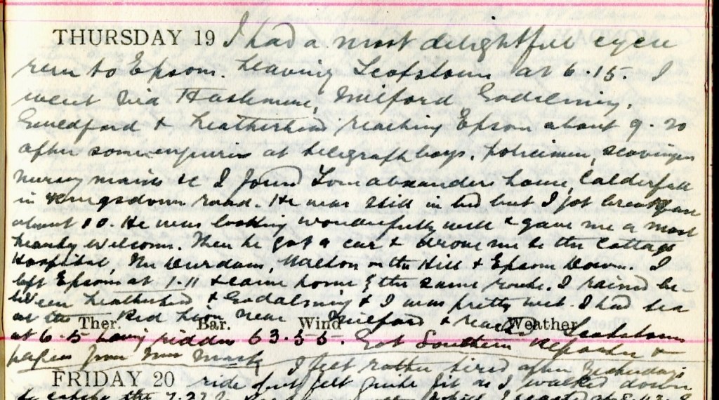 I had a most delightful cycle run to Epsom. Leaving Scotstoun1 at 6.15. I went via Haslemere, Milford, Godalming, Guildford + Leatherhead reaching Epsom about 9.20. After some enquiries at telegraph boys, policemen, scavengers, nursery maids +c I found Tom Alexander’s house Calderfall in Kingsdown Road.2 He was still in bed but I got breakfast about 10. He was looking wonderfully well + gave me a most hearty welcome. Then he got a car + drove me to the Cottage Hospital, The Durdans, Walton on the Hill and Epsom Downs.3 I left Epsom at 1.11 + came home by the same route. It rained between Leatherhead + Godalming + I was pretty wet. I had tea at the Red Lion near Milford4 + reached Scotstoun at 6.5 having ridden 63.56. Got Southern Reporter + papers from Mrs Mack.5