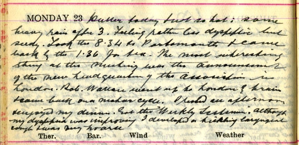 Duller today + not so hot : some heavy rain after 3. Feeling rather less dyspepsia but seedy. Took the 8.34 to Portsmouth + came back by the 1.36 for tea. The most interesting thing at this meeting was the announcement of the new headquarter of the Association in London.1 Rob. Wallace2 went up to London by train + came back on a motor cycle. I rested all afternoon + enjoyed my dinner. Got the Weekly Scotsman. Although my dyspepsia was improving I developed a tickling laryngeal cough + was very hoarse.