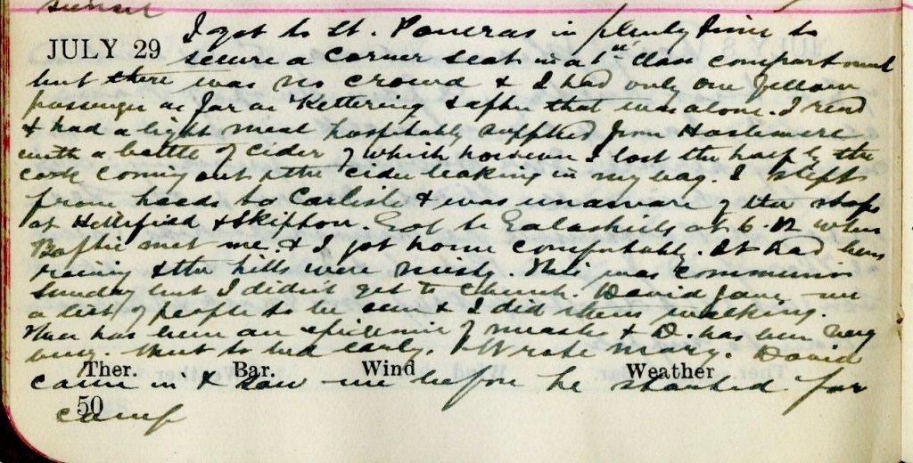 I got to St Pancras in plenty time to secure a corner seat in a 1st Class compartment but there was no crowd + I had only one fellow passenger as far as Kettering + after that was alone. I read + had a light meal hospitably supplied from Haslemere with a bottle of cider of which [illegible] I lost the half by the cork coming out + the cider leaking in my bag. I slept from Leeds to Carlisle + was unaware of the stops at Hellifield + Skipton.1 Got to Galashiels at 6.02 where Baptie2 met me + I got home comfortably. It was been raining + the hills were misty. This was Communion Sunday but I didn’t get to church. David3 gave me a list of people to be seen + I did them walking. There has been an outbreak of measles + D. has been very busy. Went to bed early. Wrote Mary.4 David came in + saw me before he started for Camp.5