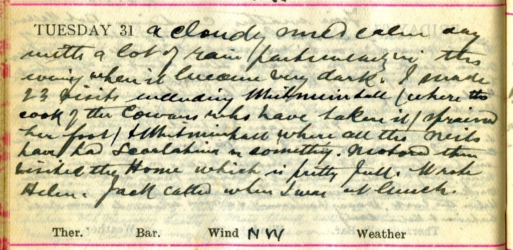 A cloudy mild calm day with a lot of rain particularly in the evening when it became very dark. I made 23 visits including Whitmuirhall (where the cook of the Cowans1 who have taken it) sprained her foot + Whitmuirhall2 where all the girls have had Scarlatina or something. Motored there. Visited the Home which is pretty full. Wrote Helen.3 Jack4 called when I was at lunch.