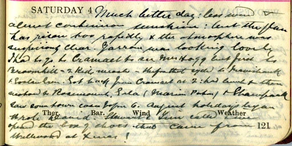 Much better day : less wind + almost continuous sunshine: but the glass has risen too rapidly + the atmosphere was suspiciously clear. Yarrow was looking lovely. I had to go to Cramalt to see Mrs Hogg1 but first to Broomhill2 – 2 kids measles – + before that cycled to Mavisbank + Goslaw Green. Got back from Cramalt at 2 : had lunch + then motored to Rosemount, Gala (Marion Paton3) + Shawpark.4 Saw some town cases before 6. August holidays began. Wrote David.5 Stewart + Tim6 called + we opened the box of chocs that came from Wellwood at Xmas!