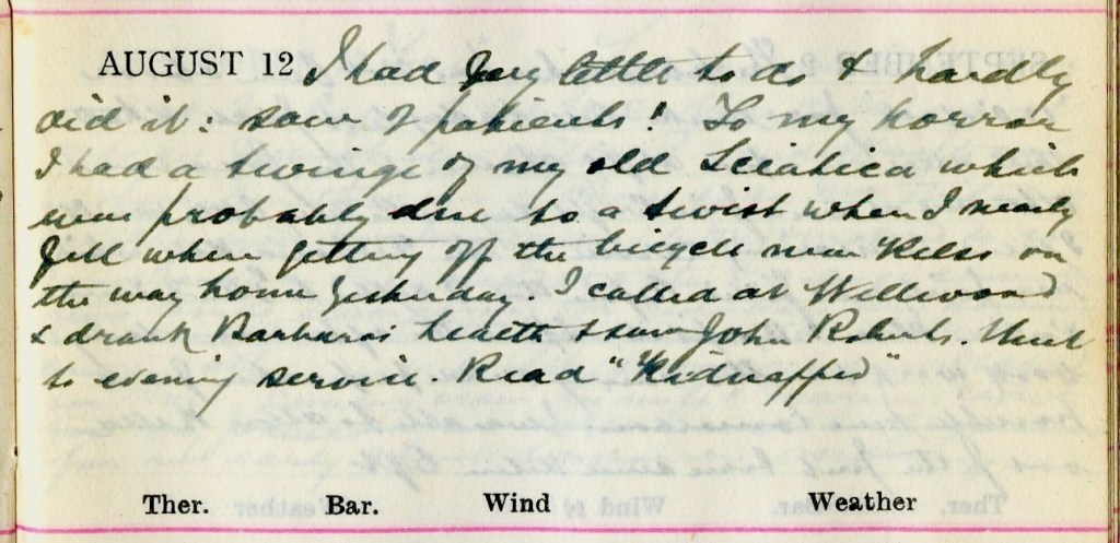 I had very little to do + hardly did did it : saw 2 patients! To my horror I had a twinge of my old Sciatica which was probably due to a twist when I nearly fell off the bicycle near Kelso on the way home yesterday. I called at Wellwood + drank Barbara’s health1 + saw John Roberts.2 Went to evening service. Read “Kidnapped”.
