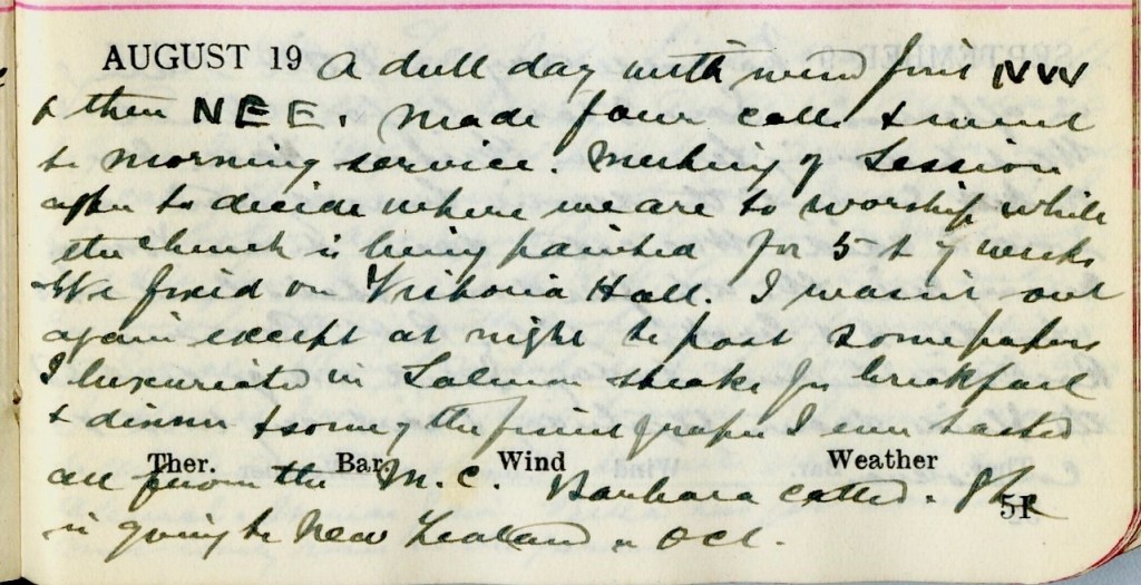 A dull day with wind first N.W. + then N.E.E. [sic]. Made four calls + went to morning service. Meeting of Session to decide where we are to worship while the church is being painted for 5 to 7 weeks. We fixed on Victoria Hall. I wasn’t out again except at night to post some papers. I luxuriated in Salmon steaks for breakfast + dinner + some of the finest grapes I have ever tasted, all from the M.C.1 Barbara2 called. She is going to New Zealand in Oct.