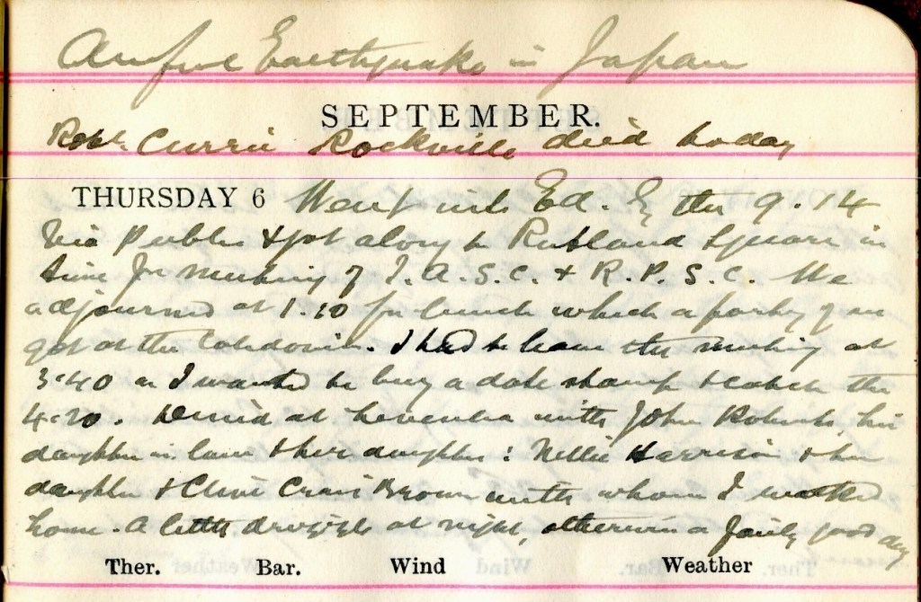 Went into Edinburgh by the 9.14 via Peebles + got along to Rutland Square in time for meeting of J.A.S.C. + R.P.S.C.3 We adjourned at 1.20 [?] for lunch which a party of us got at the Caledonian.4 I had to leave the meeting at 3.40 as I wanted to buy a date stamp + catch the 4.20. Dined at Levenlea5 with John Roberts, his daughter in law + her daughter6: Nellie Harrison + her daughter7 + Clive Craig Brown8 with whom I walked home. A little drizzle at night, otherwise a fairly good day.