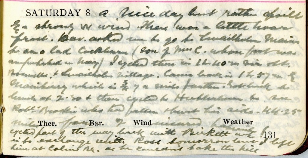 A nice day but rather spoilt by a strong W. wind. There was a little hoar frost. Dav.1 asked me to go to Smailholm Mains to see a lad Cockburn2 (son of Mrs Cockburn whose foot was amputated in May3). I cycled there in 1h 40m via St Boswells + Smailholm village. Came back in 1h 57m by Mainberry4 which is ¾ mile farther. Got back to lunch at 2.30 + then cycled to Hutlerburn to see Rob Brockie5 who had fallen + burst his side. 44.25 miles for 2 insured patients!6 Cycled part of the way back with Birkett7 who is to exchange with Ross8 tomorrow but but I left him at Colin’s Bridge9 as he couldn’t take the hill.