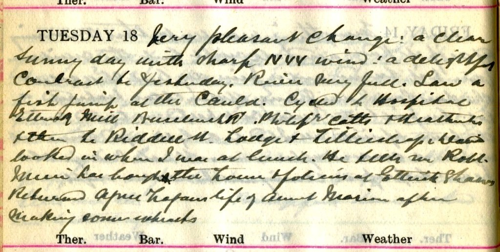 Very pleasant change: a clear sunny day with sharp N.W. wind : a delightful contrast to yesterday. River very full. Saw a fish jump at the Cauld.1 Cycled to Hospital, Ettrick Mill, Buccleuch Road, Philiphaugh Cottages + Heatherlie + then to Riddell West Lodge2 + Lilliesleaf. Robert Mein3 has bought the house + policies at Ettrick Shaws.4 Returned Agnes Logan’s Life of Aunt Marion5 after making some extracts.