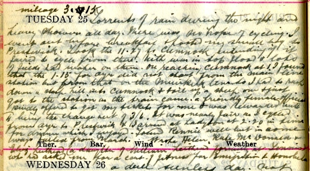 Torrents of rain during the night and heavy showers all day. There was no hope of cycling. I went out before breakfast + posted my small bag to Prestwick.1 Took the 11.27 to Cumnock2 intending if it faired to cycle from there. Nith3 was in top flood + lots of fields had water on them. On reaching Cumnock at 1, I found that the 1.15 to Ayr did not start from the mainline station but on the Muirkirk4 line so I had to rush down a steep hill to Cumnock + toil up a steep one + just got to the station as the train came. A friendly female official kindly offered to get my tickets for me + was rewarded with the 4d being the change out of 3/6. It was nearly fair as I cycled from Ayr to Prestwick + I arrived at Ladyton at 2.20 in time for dinner which I enjoyed. Found Rennie5 well but in some ways failed from March. Wrote Helen6, Kate Mcdonald7 + Eliz. Leithead8 (a daughter of William Leithead formerly at Tinnis) who had asked me for a cert. of fitness for emigration to Honolulu.