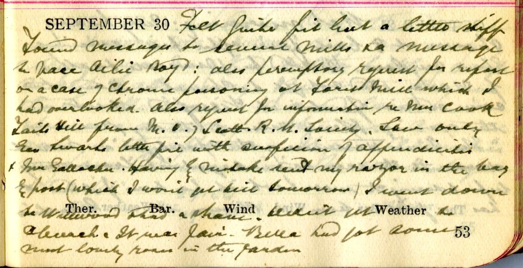 Felt quite fit but a little stiff. Found messages to several mills1 + a message to Ailie Boyd2 : also peremptory request for report on a case of chronic poisoning at Forest Mill which I had overlooked. Also request for information re Mrs Cook, Tait’s Hill3 from M.O. of Scott. R. N. Society.4 Saw only Geo. Smart’s little girl5 with suspicion of appendicitis. Mr Gallocher.6 Having by mistake sent my razor in the bag by post (which I won’t get till tomorrow) I went down to Wellwood7 + had a shave. Didn’t get to church. It was fair. Bella8 had got some most lovely roses in the garden.