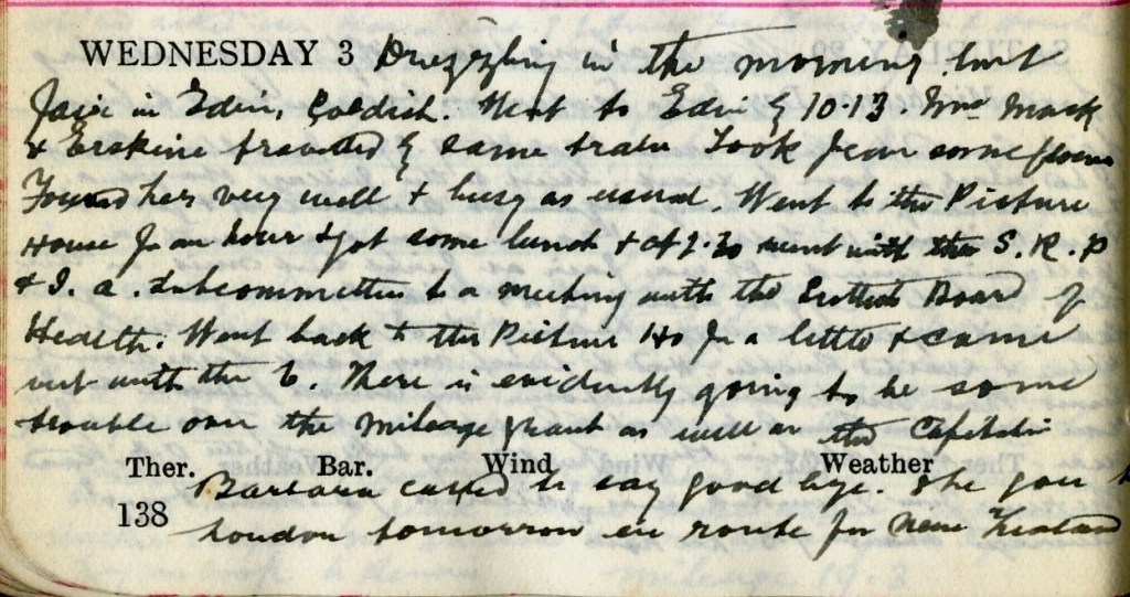 Drizzling in the morning it fair in Edinburgh, coldish. Next to Edinburgh by 10.13. Mrs Mack + Erskine1 travelled by same train. Took Jean2 some flowers. Found her very well + busy as usual. Went to the Picture House for an hour + got some lunch + at 2.30 went with the S.R.P. + J.A. Sub-committee to a meeting with the Scottish Board of Health. Went back to the Picture House for a little + came out with the 6. There is evidently going to be some trouble over the mileage grant as well as the Capitation.3 Barbara4 called to say goodbye. She goes to London tomorrow en route for New Zealand.