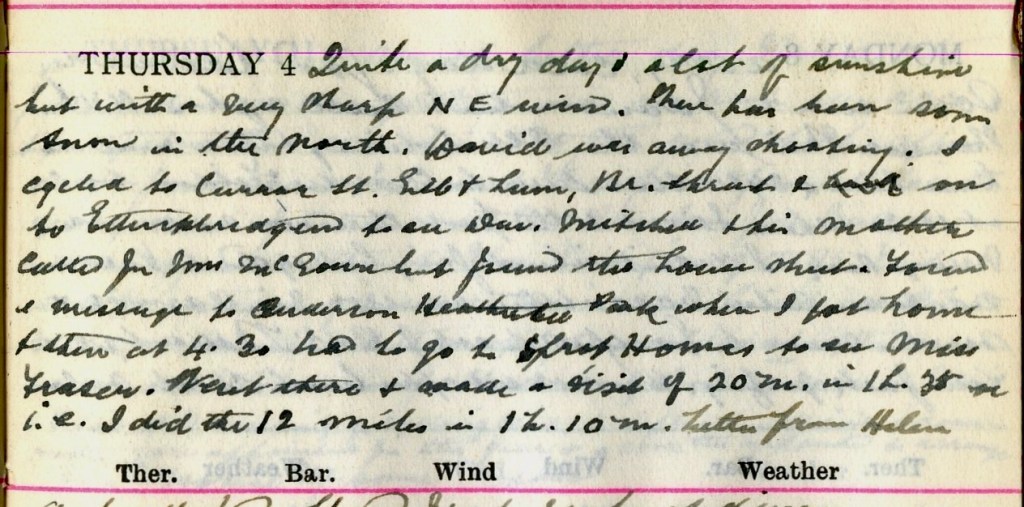 Quite a dry day + a lot of sunshine but with a very sharp N.E. wind. There has been some snow in the north. David1 was away shooting. I cycled to Curror Street, Gib. + Lum2, Bridge Street + Bank on to Ettrickbridgend to see Dav. Mitchell + his mother.3 Called for Mrs McGown4 but found the house shut. Found a message to Anderson, Heatherlie Park5 when I got home + then at 4.20 had to go to Sprot Homes.6 to see Miss Fraser.7 Went there + made a visit of 20 m. in 1h. 25m. i.e. I did the 12 miles in 1h. 10m. Letter from Helen.8
