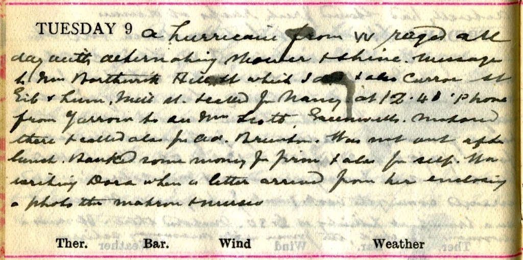 A hurricane from W. raged all day with alternating showers + shine. Message to Mrs Borthwick1, Hill Street, which I did + also Curror Street, Gib. + Lum.2, Mill Street + called for Nancy3 at 12.41. ‘Phone from Yarrow to see Mrs Scott, Greenwells.4 Motored there + called also for Adam Brunton.5 Was not out after lunch. Banked some money for firm + also for self. Was writing Dora when a letter arrived from her enclosing a photo of the matron + nurses.6