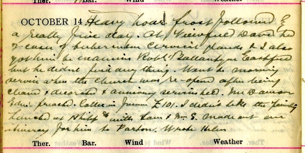 Heavy hoar frost followed by a really fine day. At Viewfield David had 2 cases of tuberculous cervical glands + I also got him to examine Robert Ballantyne, Eastfield, but he didn’t find anything. Went to morning service when the Church was re-opened after being cleaned + decorated + anniversary services held. Mr Dawson, Edinburgh, preached. Collection in forenoon £101. I didn’t like the painting [?]. Lunched at Philiphaugh with Sam + Mrs S. Made out an itinerary for him for Paxton [?]. Wrote Helen.