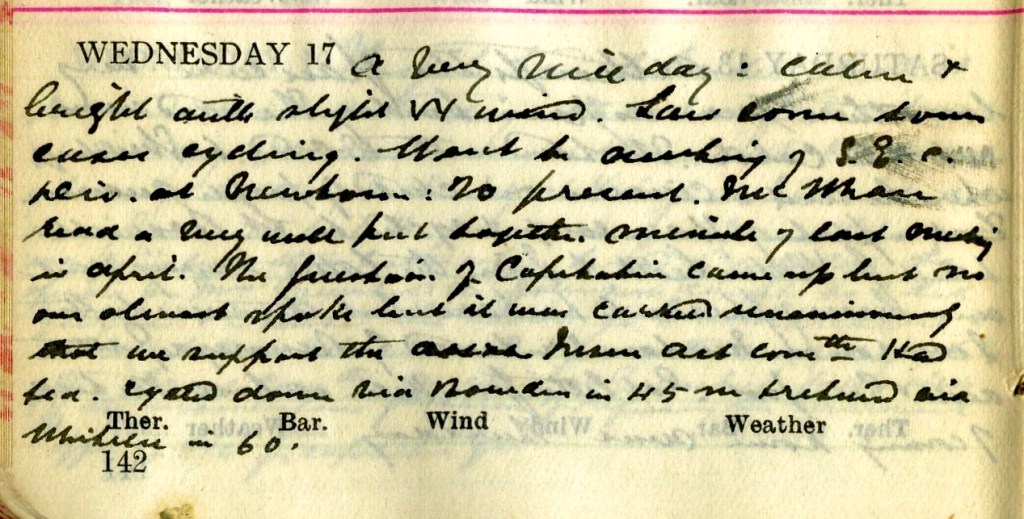 A very mild day : calm + bright with slight W. wind. Saw some town cases cycling. Went to meeting of S.E.C. Division at Newtown1 : 20 present. McWhan2 read a very well put-together minute of last meeting in April. The question of capitation came up but no one almost [sic] spoke but it was carried unanimously that we support the [word deleted] Insurance Action Committee.3 Had tea. Cycled down via Bowden in 45 minutes + returned via Whitelee in 60.4