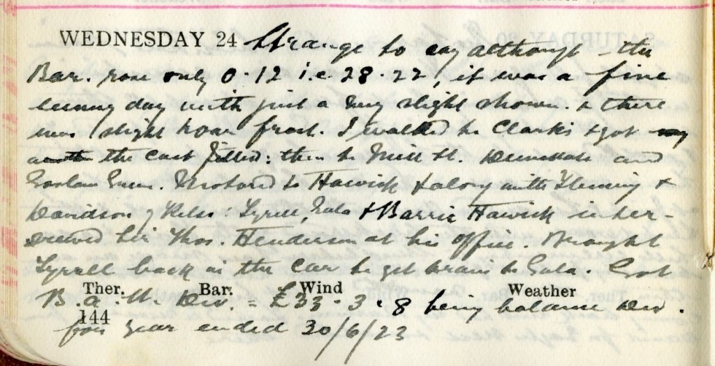 Strange to say although the Barometer rose only 0.12 i.e. 28.22, it was a fine sunny day with just a very slight shower + there was slight hoar frost. I walked to Clark’s + got my another the cast fitted1: then to Mill Street, Dunsdale and Goslaw Green. Motored to Hawick + along with Fleming2 + Davidson of Kelso3: Tyrell, Gala4 + Barrie, Hawick5 interviewed Sir Thomas Henderson6 at his office. Brought Tyrell back in the car to get train to Galashiels.7 Got B.A.U. Dividend of £33 – 3 – 8 being balance Dividend from year ended 30/6/23.