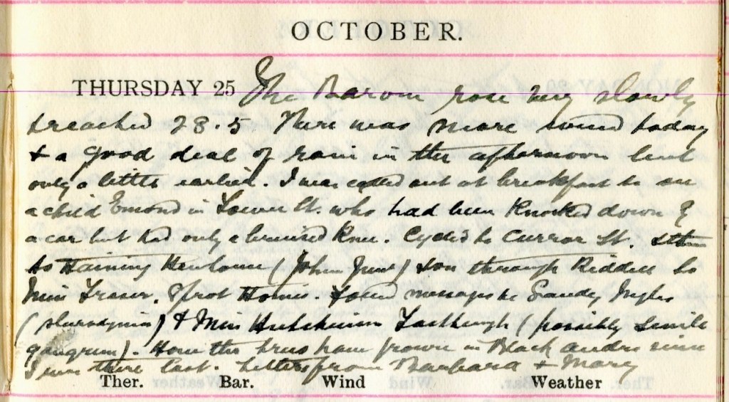 The Barometer rose very slowly + reached 28.5. There was more wind today + a good deal of rain in the afternoon but only a little earlier. I was called out at breakfast to see a child Emond in Tower Street1 who had been knocked down by a car but had only a bruised knee. Cycled to Curror Street + then to Haining Henhouse (John junior2) + on through Riddell to Miss Fraser, Sprot Homes.3 Found messages to Sandy Ingles4 (pleurodynia) + Miss Hutchison, Fastheugh5 (possibly senile gangrene). How the trees have grown in Black Andro since I was there last.6 Letters from Barbara7 + Mary.8