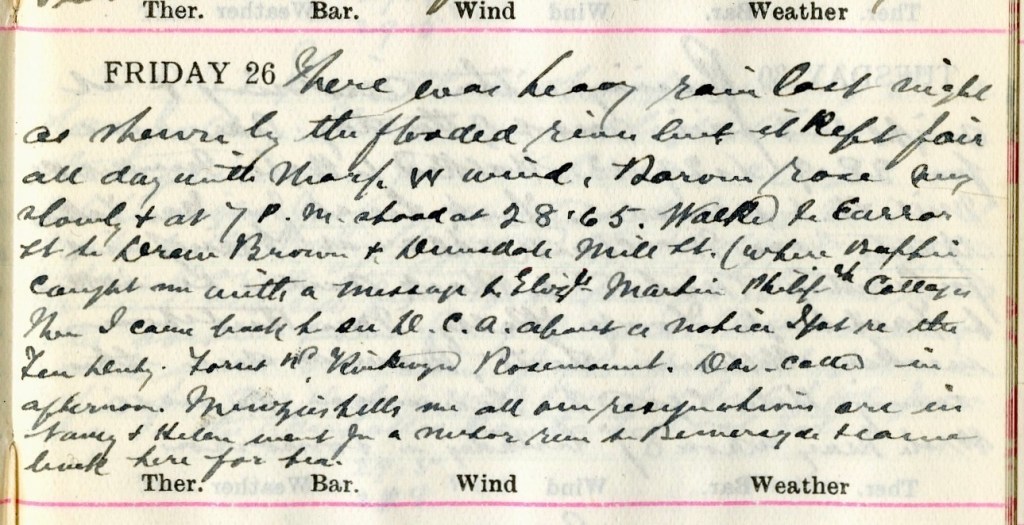 There was heavy rain last night as shown by the flooded river but it kept fair all day with [a] sharp W. wind. Barometer rose very slowly + at 7 p.m. stood at 28.65. Walked to Curror [?] Street to Drew Brown1 + Dunsdale, Mill Street (where Baptie2 caught me with a message to Elizabeth Martin, Philiphaugh Cottages).3 Then I came back to see D.C.A.4 about a notice I got re the Feu Duty, Forest Road, Kirkwynd [and] Rosemount. Dav.5 called in afternoon. Menzies6 tells me all our resignations are in.7 Nancy8 + Helen9 went for a motor run to Bemersyde + came back here for tea.