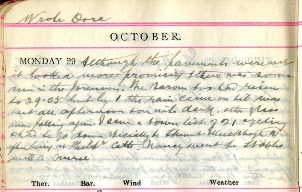 Although the pavements were wet it looked promising + there was some sun in the forenoon. The Barometer too had risen to 29.05 but by 1 the rain came on + it was wet all afternoon + on into the dark + then glass was falling again. I saw a town list of 21 cycling + had to go down specially to Stewart, Ettrickhaugh Road2 after being at Philiphaugh Cottages. Nancy3 went to Stables with a nurse.