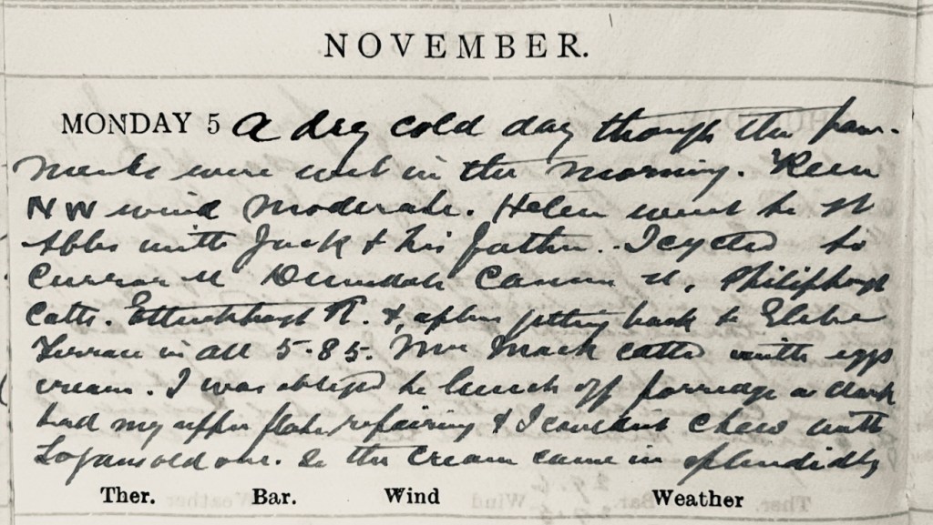 A dry cold day though the pavements were wet in the morning. Keen N.W. wind, moderate. Helen1 went to St Abbs2 with Jack + his father.3 I cycled to Curror Street, Dunsdale, Cannon Street, Philiphaugh Cottages, Ettrickhaugh Road + after getting back to Glebe Terrace in all 5.85 [miles]. Mrs Mack4 called with eggs [and] cream. I was obliged to lunch off porridge as Clark5 had my upper plate repairing + I couldn’t chew with Logan’s6 old one, so the cream came in splendidly.