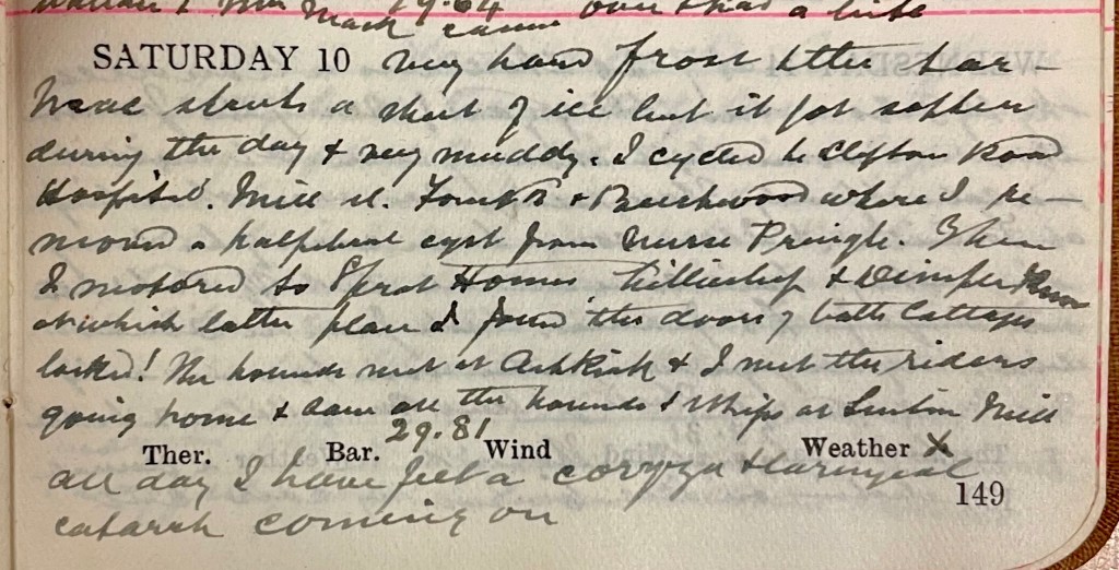 Very hard frost + the tarmac streets a sheet of ice but it got softer during the day + very muddy. I cycled to Clifton Road, Hospital, Mill Street, Forest Road + Beechwood where I removed a [illegible] cyst from nurse Pringle.1 Then I motored to Sprot Homes, Lilliesleaf + Dimpleknowe at which latter place I found the doors of both cottages locked!2 The hounds met at Ashkirk + I met the riders going home + saw all the hounds + whips at Sinton Mill. All day I have felt a Coryza + laryngeal catarrh coming on.