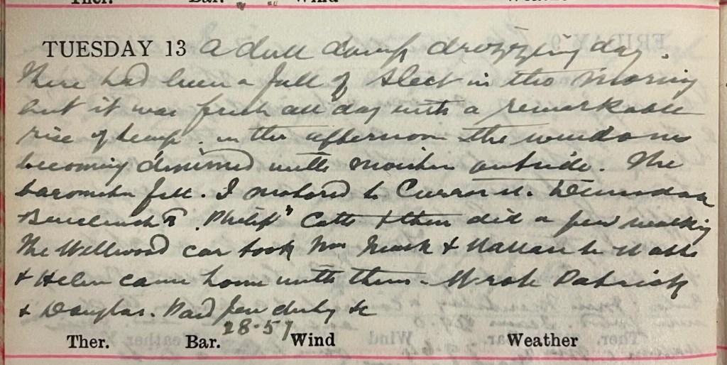 A dull damp drizzling day. There had been a fall of sleet in the morning but it was fresh all day with a remarkable rise of temperature, the windows becoming dimmed with moisture outside. The barometer fell. I motored to Curror Street, Dunsdale, Buccleuch Road, Philiphaugh Cottages + then did a few walking. The Wellwood1 car took Mrs Mack2 + Wallace3 to St Abbs4 + Helen5 came home with them. Wrote Patrick6 + Douglas.7 Paid Feu duty +c. Barometer: 28.57