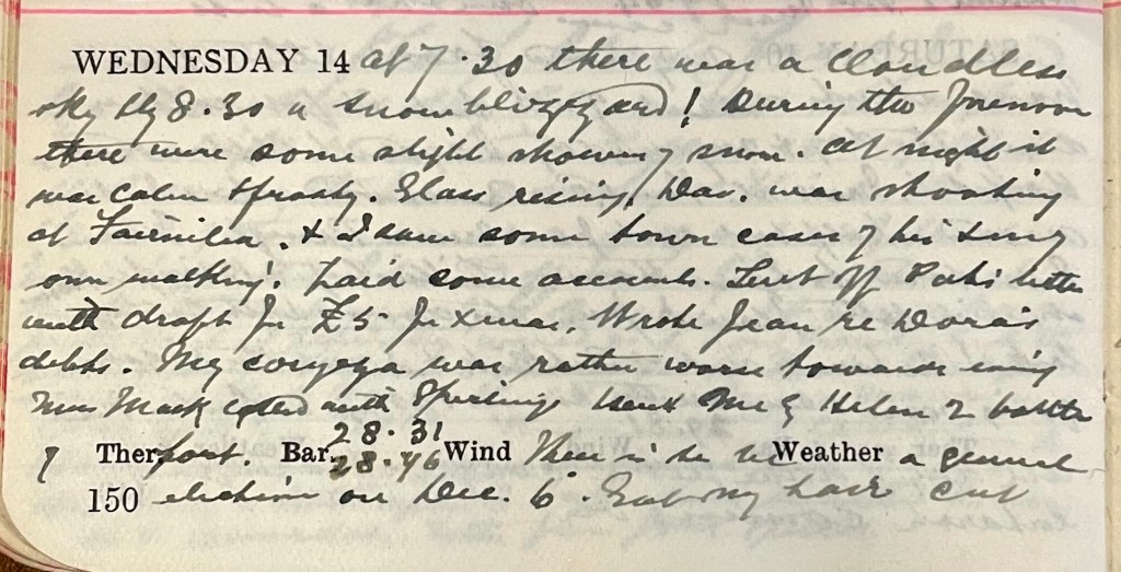At 7.30 there was a cloudless sky + by 8.30 a snow blizzard! During the forenoon there were some slight showers of snow. At night it was calm + frosty. Glass rising. Dav.1 was shooting at Fairnilee + I saw some town cases of his + own walking! Laid some accounts. Sent off Pat’s letter with draft for £5 for Xmas.2 Wrote Jean3 re Dora’s debts4 my Coryza was rather worse towards evening. Mrs Mack5 called with Sperlings [sic]6 + sent me by Helen7 2 bottles of Port. There is to be a general election on December 6.8 Got my hair cut. Barometer : 28.31 28.76
