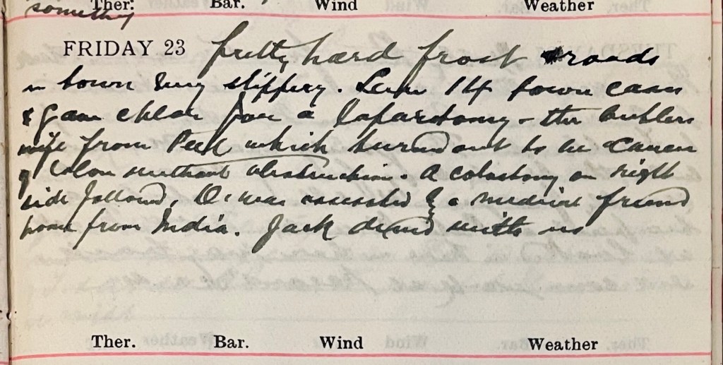 Pretty hard frost roads in town very slippery. Saw 14 town cases + gave chlor[oform] for a laparotomy – the butler’s wife from Peel1 which turned out to be cancer of colon + without adhesions. A colostomy on right side followed. D.2 was assisted by a medical friend friend home from India. Jack3 dined with us.