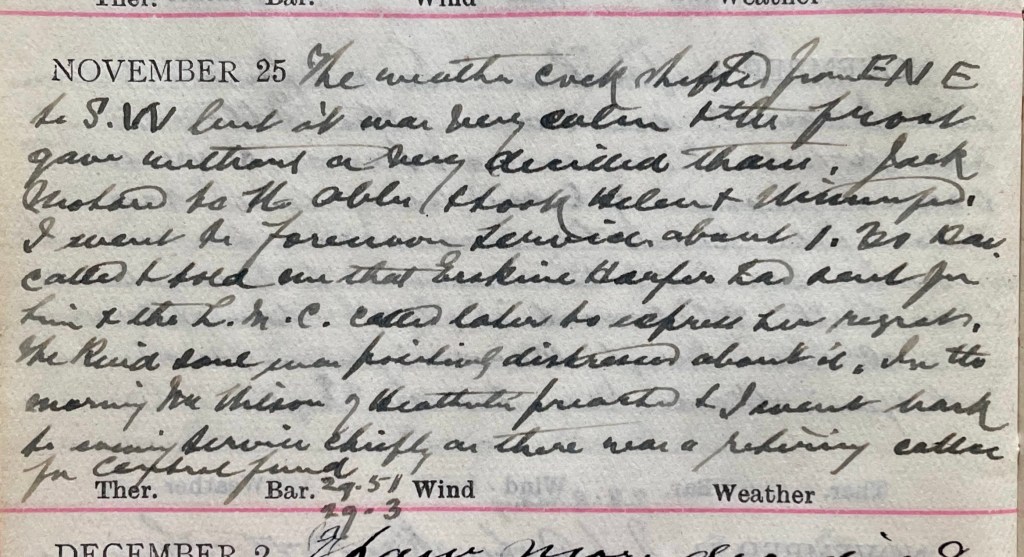 The weather cock shifted from E.N.E. to S.W. but it was very calm + the frost gone without a very decided thaw. Jack1 motored to St Abbs2 + took Helen3 + Winifred.4 I went to forenoon service. About 1.30 Dav.5 called + told me that Erskine Harper6 had sent for him + the L.M.C.7 called later The kind soul was faintingly [?] distressed about it. In the morning Mr Wilson of Heatherlie8 preached + I went back to evening service chiefly as there was a retiring collec[ion ?] for Capital fund.