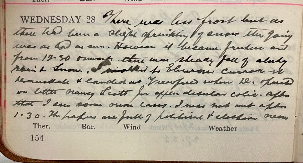 There was less frost but as had been a slight sprinkling of snow the going was as bad as ever. However it became fresher and from 12.30 onwards there was [a] steady fall of slushy rain + snow. I walked to Elmrow, Curror Street, Dunsdale + landed at Viewfield1 where D.2 operated on little Nancy Scott3 for appendicular colic. After that I saw some new cases. I was not out after 1.30. The papers are full of political + election news.4