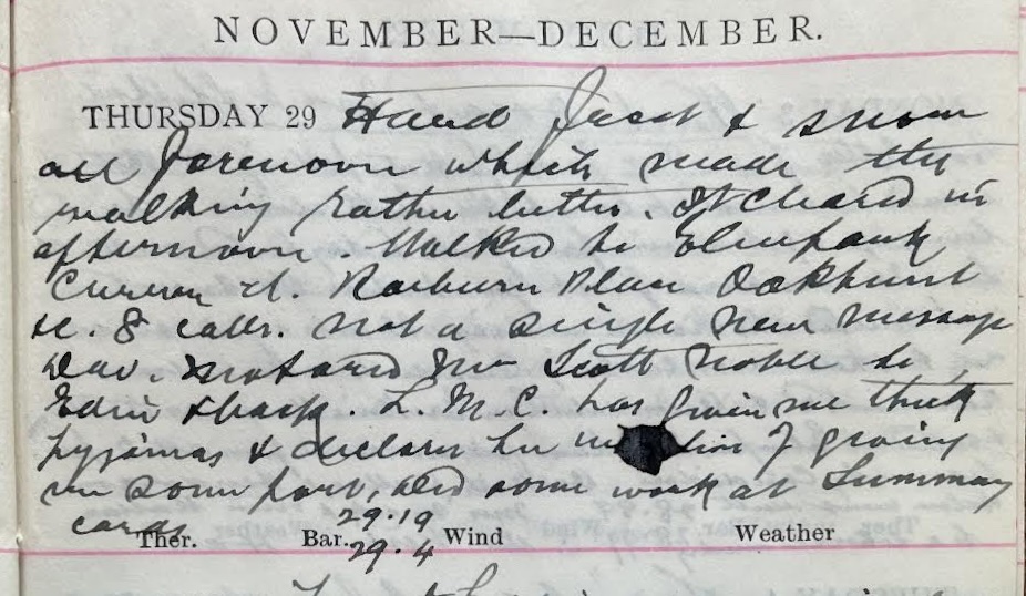 Hard frost + snow all forenoon which made the walking rather better. It cleared in afternoon. Walked to Elmpark, Curror Street, Raeburn Place, Oakhurst +c. 8 calls. Not a single new message. Dav.1 motored Mr Scott Noble2 to Edinburgh + back. L.M.C.3 has given me thick pyjamas + declared her intention of giving me some Port. Did some work at Summary Cards. Barometer: 22.19 29.4.