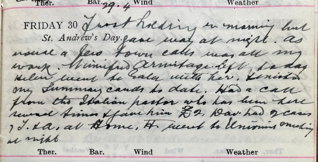 Frost holding in morning but gave way at night. As usual a few town calls was all my work. Winifred Armitage1 left, today Helen2 went to Gala with her. Finished my Summary Cards to date. Had a call from the Italian pastor3 who has been here several times + gave him £2. Dav.4 had 2 cases of T. & A.5 at Home6 H. [Helen] went to Unionist meeting at night.