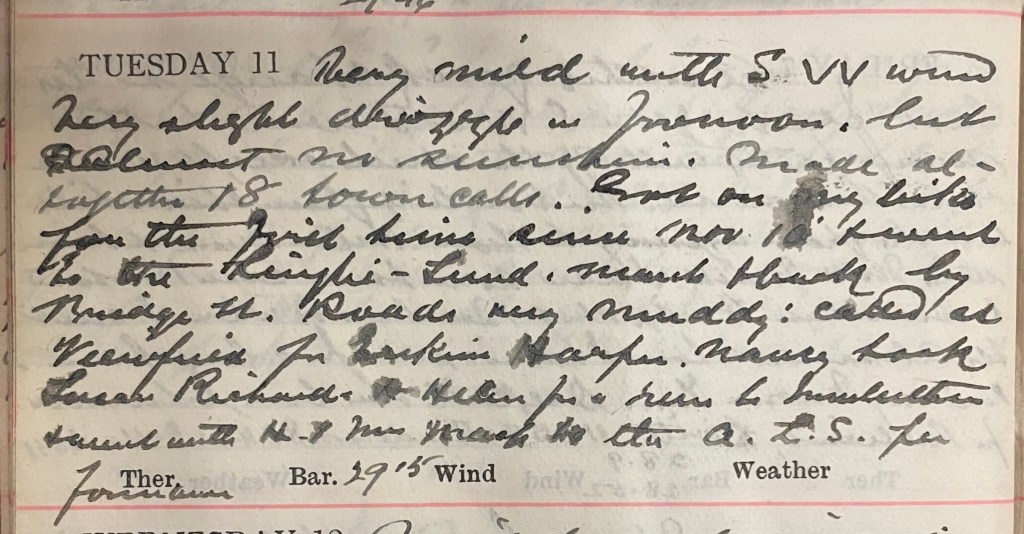 Dry mild with S.W. wind [and] very slight drizzle in forenoon but no sunshine. Made altogether 18 town calls. Got on my bike for the first time since November 10th + went to the Linglie – Sunderland March + back by Bridge Street. Roads very muddy : called at Viewfield1 for Erskine Harper.2 Nancy3 took Susan Richards4 + Helen5 for a run to Innerleithen + went with H. + Mrs Mack6 to the A.L.S. performance.7