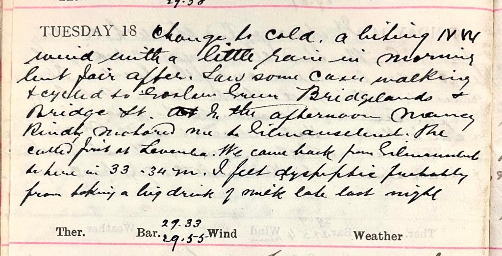 Change to cold. A biting N.W. wind with a little rain in morning but fair after. Saw some cases walking + cycled to Goslaw Green, Bridgelands + Bridge Street. In the afternoon Nancy1 kindly motored me to Gilmanscleuch.2 She called first at Levenlea.3 We came back from Gilmanscleuch to here in 33 -34 minutes.4 I felt dyspeptic probably from taking a big drink of milk late last night.