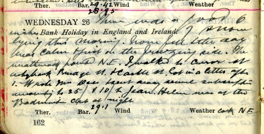 There was a good 6 inches of snow lying this morning. None fell + the day was calm + just on the freezing side. The weathercock pointed N.E. I walked to Curror Street, Ashybank, Bridge Street + Castle Street. Got in a little after 1. Wrote Mrs Dees1 + sent away several subscriptions amounting to 25/- [shillings] + 10/- to Jean.2 Helen3 was at the Badminton Club at night.