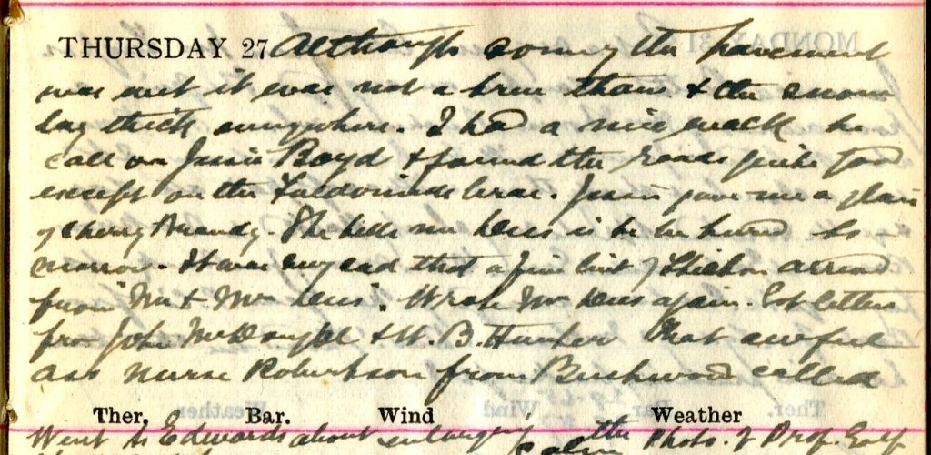Although some of the pavements were wet it was not a true thaw + the snow lay thick everywhere. I had a nice walk to call on Jessie Boyd1 + found the roads quite good except on the Faldonside brae. Jessie gave me a glass of Cherry Brandy. She tells me Dees2 is to be buried tomorrow. It was very sad that a fine bit of Stilton [?] arrived from Mr + Mrs Dees. Wrote Mrs Dees3 again. Got letters from John McDougall4 + W B Hunter.5 That awful ass Nurse Robertson6 from Beechwood called.