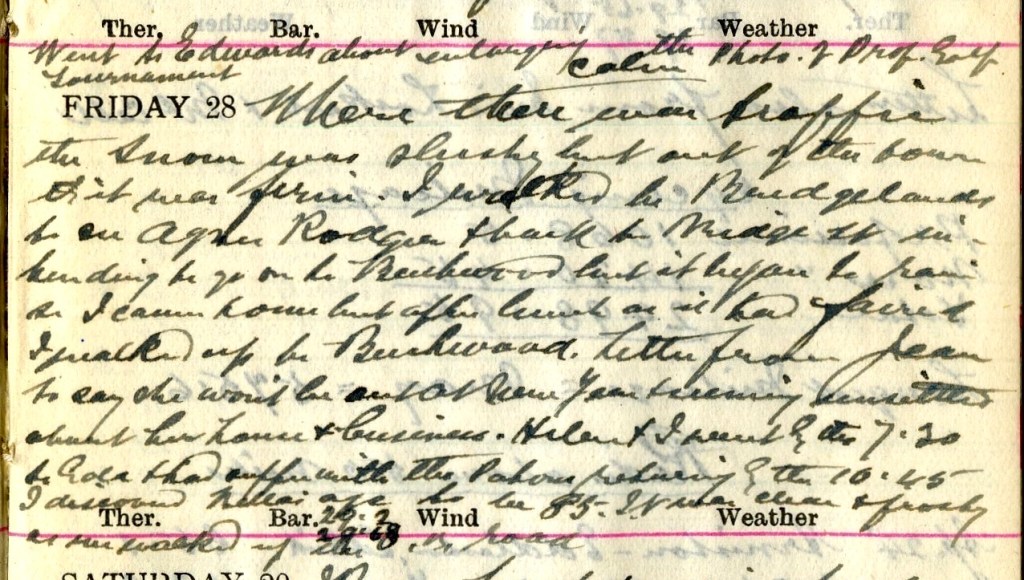Where there was traffic the snow was slushy but out of the town it was firm. I walked to Bridgelands to see Agnes Rodger3 + back to Bridge Street intending to go on to Beechwood4 but it began to rain so I came home but after lunch as it had faired I walked up to Beechwood. Letter from Jean5 to say she won’t be out at New Year + seeming unsettled about her house + business. Helen6 + I went by the 7.20 to Gala + had supper with the Patons7 returning by the 10.45. I discovered Bella’s age to be 85. It was clear + frosty as we walked up the road.