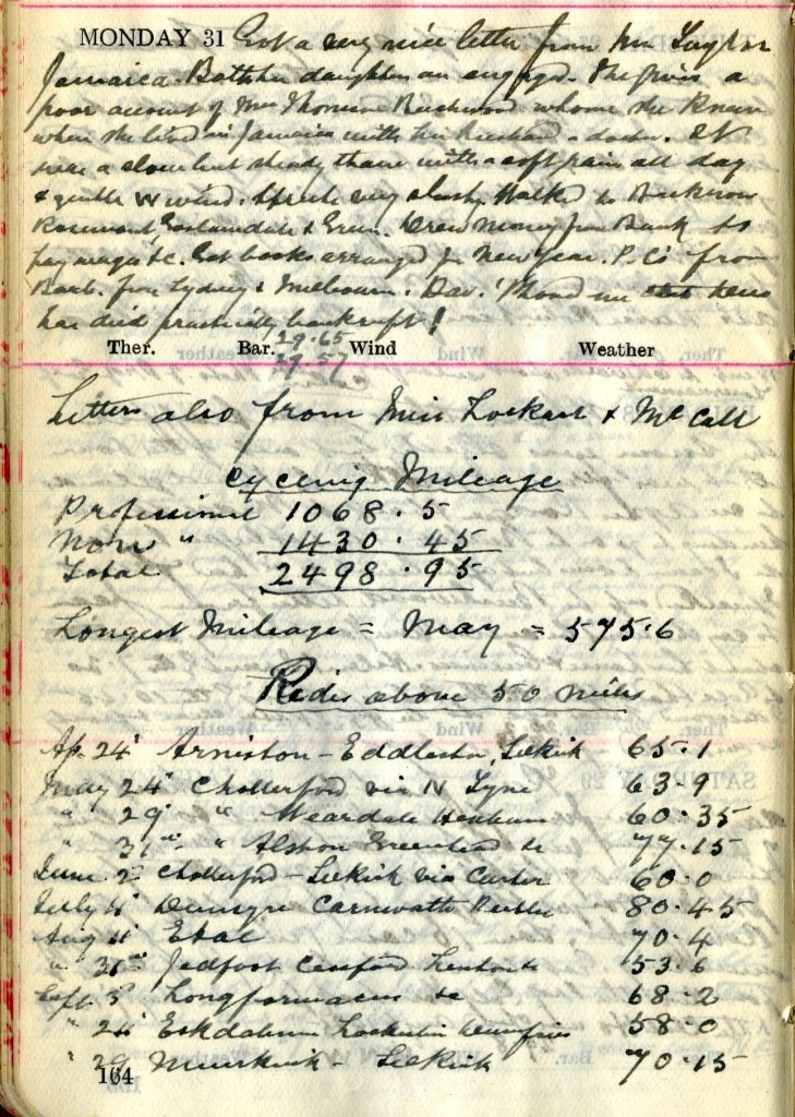 Got a very nice letter from Mrs Taylor, Jamaica.1 Both her daughters are engaged. She give a good account of Mrs Thomson, Beechwood, whom she knew when she lived in Jamaica with her husband, a doctor.2 It was a slow but steady thaw with a soft rain all day + gentle W. wind. Streets very slushy. Walked to Backrow, Rosemount, Goslawdales + Green. Drew money from Bank to pay wages +c. Got books arranged for New Year. P.C.s [postcards] from Barbara from Sydney + Melbourne.3 Dav.4 ‘Phoned me that Dees had died practically bankrupt!5 Barometer: 29.65 27.57