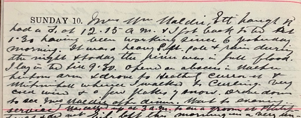 Mrs Wm Waldie, Ettrickhaugh Road had a d.1 at 12.15 a.m. + I got back to bed at 1.30 having been working since 6 yesterday morning. It was a heavy S.W. gale + rain during the night + today the river was in full flood. I lay in bed till 9.30. Opened an abscess in Walter Linton’s arm2 + drove to Heatherly, Curror Street + Whitmuirhall whence I walked to Curling.3 Very cold wind + a few flakes of snow. Drove down to see Mrs Waldie after dinner. Went to evening service.