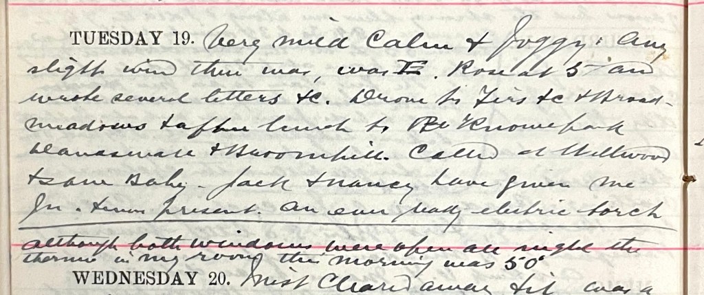 Very mild calm + foggy : any slight wind there was, was E. Rose at 5 and wrote several letters +c. Drove to Firs +c + Broadmeadows + after lunch to Knowepark, Dandswall + Broomhill. Called at Wellwood to see Baby.1 Jack + Nancy2 have given me for a Xmas present an ever ready [sic] electric torch.3