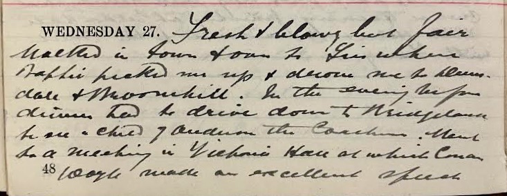 Fresh + blowy but fair. Walked in town + over to Firs1 where Baptie2 picked me up + drove me to Dunsdale + Broomhill. In the evening before dinner had to drive down to Bridgelands to see a child of Anderson the coachman.3 Went to a meeting in Victoria Hall at which Conan Doyle made an excellent speech.4