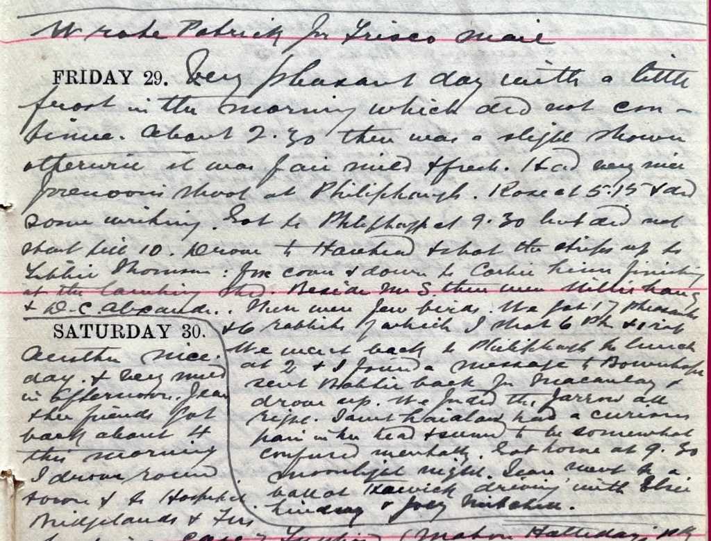 Very pleasant day with a little frost in the morning which did not continue. About 2.30 there was a slight shower otherwise it was fair mild + fresh. Had very nice forenoon shoot at Philiphaugh.3 Rose at 5.15 + did some writing. Got to Philiphaugh at 9.30 but did not start till 10. Drove to Harehead + shot the strips up to Tibbie Thomson : fox cover + down to Corbie Linn, finishing at the lambing shed.4 Beside Mr S.5 there was Willie Lang6 + D. C. Alexander.7 There were few birds. We got 17 pheasants + 6 rabbits of which I shot 6 Ph. + 1 rit [sic]. We went back to Philiphaugh to lunch at 2 + I found a message to Bowerhope.8 Sent Baptie9 back for Macaulay10 + drove up. We forded the Yarrow all right.11 Janet Laidlaw12 had a curious pain in her head + seemed to be somewhat confused mentally. Got home at 9.30. Moonlight night. Jean13 went to a ball at Hawick driving with Elsie Lindsay14 + Joy Mitchell.15