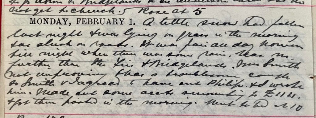 Rose at 5. A little snow had fallen last night + was lying on grass in the morning + as slush on roads. It was fair all day however till night when there was some rain. Was no further than The Firs + Bridgelands. Mrs Smith1 not improving + has had a troublesome cough so Smith2 + I agreed to have out Philip3 + I wrote him. Made out some accounts amounting to £114. + got them posted in the morning. Went to bed at 10.