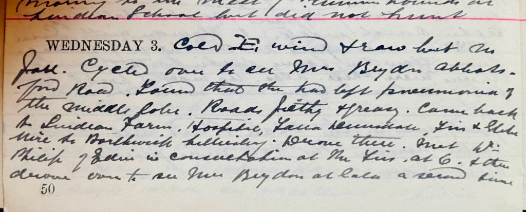 Cold E. wind + raw but no fall [?]. Cycled over to see Mrs Brydon, Abbotsford Road.1 Found that she had left pneumonia of the middle ? Roads filthy + greasy. Came back to Lindean Farm, Hospital, Falla, Dunsdale2, Firs + Glebe. Wire to Borthwick, Lilliesleaf.3 Drove there. Met Dr Philip of Edinburgh4 in consultation at the Firs5 at 6 + then drove over to see Mrs Brydon at Gala a second time.