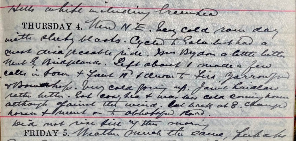 Wind N.E. Very cold raw day with sleety blasts. Cycled to Gala but had a most disagreeable ride. Mrs Brydon1 a little better. Went by Bridgelands. Left about 1 + made a few calls in town + Forest Road + drove to Firs2, Yarrowford + Bowerhope.3 Very cold going up. Janet Laidlaw rather better. Got cosy tea + was less cold coming home, although against the wind. Got back at 8. Changed horses + went on to Abbotsford Road.