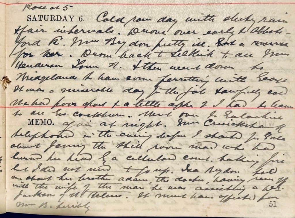Cold day with sleety rain+ fair intervals. Drove over early to Abbotsford Road. Mrs Brydon1 pretty ill. Got a nurse for her. Drove back to Selkirk to see a Mrs Henderson, Tower Street2 + then went down to Bridgelands to have some ferreting with George.3 It was an awful day for the job + awfully cold. We had poor sport + a little after 2 I had to leave to see Geo. Cockburn.4 Went over to Galashiels again at night. Mrs Cruickshank5 telephoned in the evening before I started for Galashiels about Jenny6 the still room maid who had burned her head by a celluloid comb taking fire but I did not need to go up. Isa Brydon7 told me about her brother Adam8, the doctor, having run off with the wife of the man he was assisting, a Dr Jackson at St Helens.9 It must have affected poor Mrs B terribly.