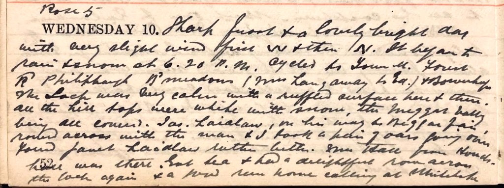 Sharp frost + a lovely bright day with very slight wind, first W. + then N. It began to rain + snow at 6.20 p.m. Cycled to Tower Street, Forest Road, Philiphaugh, Broadmeadows (Mrs Lang away to Edinburgh1) + Bowerhope.2 The Loch was very calm with a ruffled surface here + there. All the hill tops were white with snow, the Megget valley being all covered. James Laidlaw3 on his way to Biggar Fair4 rowed across with the man + I took a pair of oars going over. Found Janet Laidlaw5 rather better. Mrs Hall from Houdshall6 was there. Got tea + had a delightful row across the loch again + a good run home calling at Whitehope7, Yarrowford + The Firs. The roads got soft in the sun but one could get a hard track in the shadows on the S. side of the road.