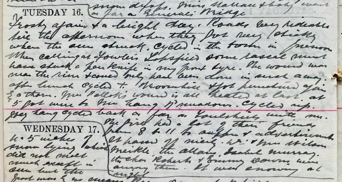Frosty again + a bright day. Roads very redeable till the afternoon when they got very sticky when the sun struck. Cycled in the town in forenoon. When calling at Fowler’s, Topsfield1, some rascal stuck a pen knife in my front tyre. The would was round the rim + could only have been done in such a way. After lunch cycled to Broomhill + got punctured again by a thorn. Mrs Pollok’s wound2 is all healed at last. At 5 got wire to Mrs Lang, Broadmeadows.3 Cycled up. May Lang4 cycled back as far as Foulshiels with me. The girls5 had a lot of their friends from 8 to 11 to supper + advertisements. It passed off nicely. Dr + Mrs Wilson6, Meikle, the Allans, Isobel Murray7, the Chas. Roberts8 + Emmy Downs9 were among them. It was snowing at night.