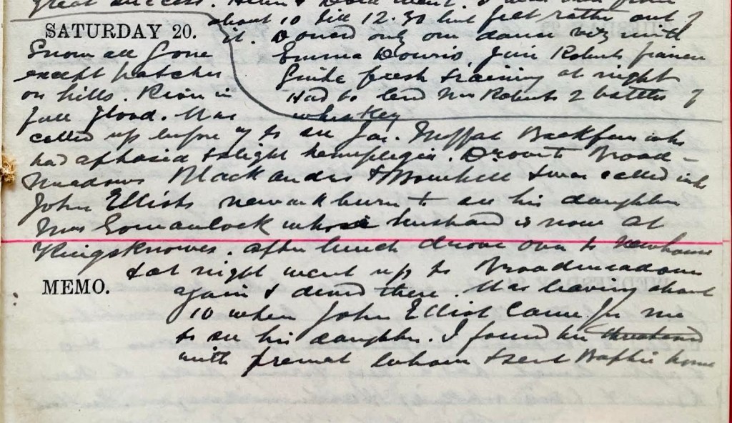 Snow all gone except patches on hills. River in full flood. Was called up before 7 to see Jas. Moffat, Backfeus1, who had aphasia + slight hemiplegia. Drove to Broadmeadows, Black Andro + Bowhill + was called into John Elliot’s, Newarkburn2 to see his daughter Mrs Govanlock whose husband is now at Kingsknowes.3 After lunch drove over to Newhouse4 + at night went up to Broadmeadows again + dined there. Was leaving about 10 when John Elliot came for me to see his daughter. I found her [word deleted] with premature labour5 + sent Baptie7 home.
