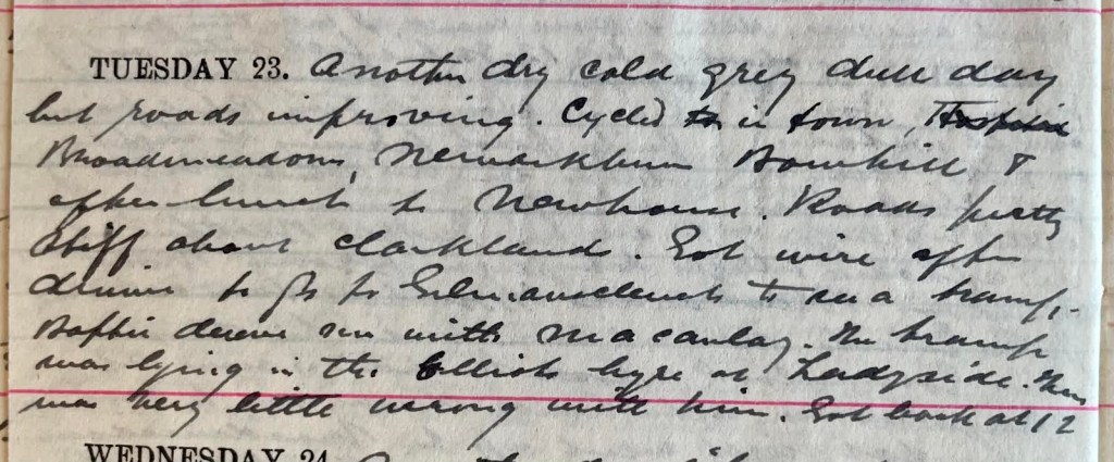 Another dry cold grey dull day but roads improving. Cycled in town, Hospital Broadmeadows, Newarkburn, Bowhill + after lunch to Newhouse. Roads pretty stiff about Clarklands.1 Got wire after dinner to go to Gilmanscleuch to see a tramp. Baptie2 drove me down with Macaulay.3 The tramp was lying in the Elliots’ byre at Ladyside.4 There was very little wrong with him. Got back at 12.